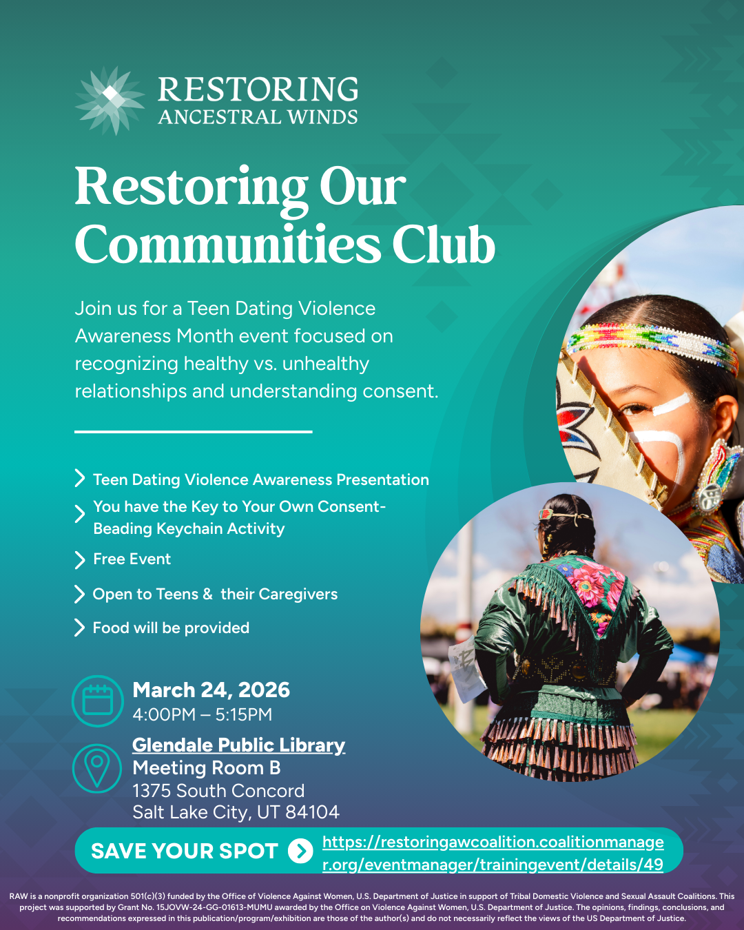 Join Restoring Ancestral Winds (RAW) for a Teen Dating Violence Awareness Month (TDVAM) training that focuses on recognizing healthy and unhealthy relationships and understanding consent. Register now with RAW and view more information here.