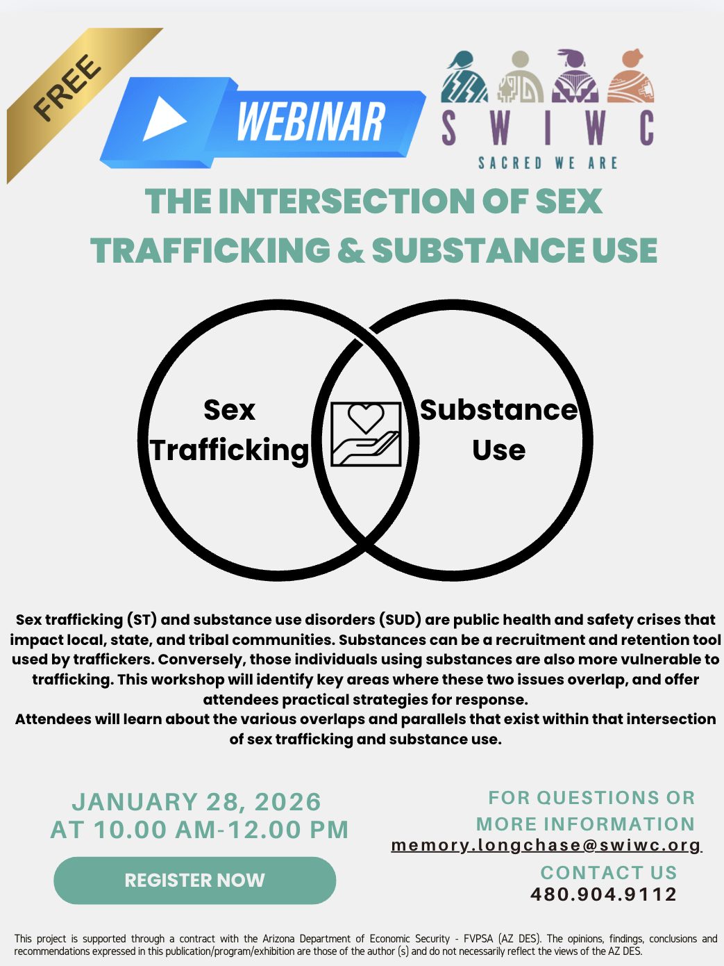 Join SWIWC for a virtual webinar on the The Intersection of Sex Trafficking and Substance Use. Visit their official event page here- "Sex trafficking (ST) and substance use disorders (SUD) are public health and safety crises that impact local, state, and tribal communities. Substances can be a recruitment and retention tool used by traffickers. Conversely, those individuals using substances are also more vulnerable to trafficking. This workshop will identify key areas where these two issues overlap, and offer attendees practical strategies for response. Attendees will learn about the various overlaps and parallels that exist within that intersection of sex trafficking and substance use." DATE: Wednesday, January 28, 2026 TIME: 10am - 12pm MST (Phoenix Time) LOCATION: Zoom. Meeting/Log-in information will be provided upon registration. For questions or concerns: please reach out to memory.longchase@swiwc.org OR tania.harvey@swiwc.org